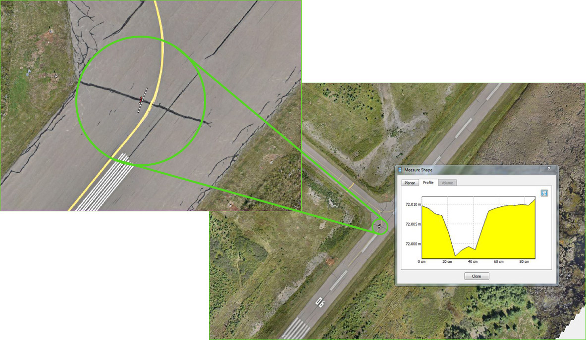 mm level profiles of a runway crack captured by a Surveyor 630 UAV flying 100m above the runway